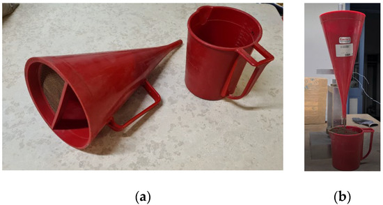 Hence, once the required amount of dry soil, lime, or cement, water, and additives was mixed, the flowability of the mixture was estimated using the Marsh cone test. In Figure 6, the Marsh cone test tools (Figure 6a) and procedure (Figure 6b) are shown. The procedure consists of passing a volume of the fresh mixture through the 4.75 mm test nozzle and recording the time that it takes to pass 1000 mL. For standard site machines, times between 35″ and 55″ are recommended, although times up to 120″ or 240″ can still be considered still as optimal or acceptable, respectively.
