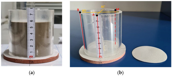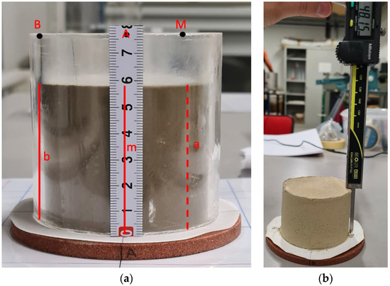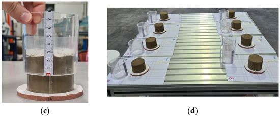 In Figure 7, the non-standard procedure of the shrinkage test carried out on each mixture is shown. The mixture was poured into the Plexiglas cylinder up to a height of approximately 6 cm. A filter paper was then gently placed on top. A porous stone and a sheet of filter paper were at the bottom of the cylinder to allow for drainage (see Figure 7a). Measurements of the cylinder’s cross-sectional diameters (Figure 7b) and the initial height were taken. As shown in Figure 7c, after approximately 48 h, the cylinder was pulled out, and the material stuck at the surface was weighed and taken into account in the volume and weight calculations. Tests ran for approximately 21 days (Figure 7d). The tests were conducted at the geotechnical laboratory of the University of Brescia, where the temperature is maintained at around 20 degrees. After the mixture slurries were prepared, they were immediately poured into the cylinder. Small temperature and humidity fluctuations can have an influence on the shrinkage rate; however, a final water content check after 21 days ensured that a dry condition was achieved for all specimens. Five methods were used to estimate the volume [22].