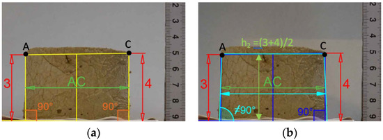 Shape of the cross-sectional area. (a) Method 2, a rectangle trapezoid (yellow line); and (b) Method 3, a scalene trapezoid (blue line).