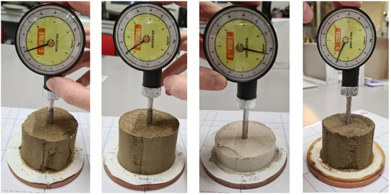 In Figure 12, the qualitative tests carried out with the pocket penetrometer on Caorso soil samples were shown. The tests were carried out on the seventh day of the shrinkage test on four samples (Table 3) featuring, approximately, the same amount of water except for the third sample, which was a cement and bentonite sample (no soil) with a very high amount of water (as standardized in situ, w = 340%). The three soil samples were improved with lime, cement, or nothing. Super-plasticising sulphonated naphthalene admixture was added. Of course, it was added to all of the soil mixtures to maintain similar conditions.