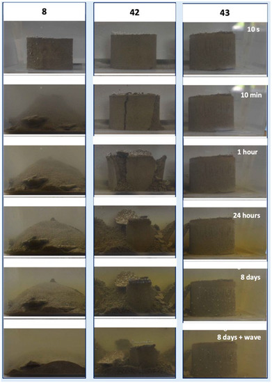 After the shrinkage tests, as reported in Table 3, indicating the days before immersion, all 45 samples were dipped in water according to the crumb test. In Figure 13, three examples were shown at five different times during which the water was stationary (10 s, 10 min, 1 h, 24 h, 8 days). The last row of pictures in Figure 13 refers to a time after the application of a wave. The three examples in the Figure 13 (samples 8, 42, and 43) refer to the three different final states of the sample after the crumb test: destroyed, broken into pieces, and intact, respectively.