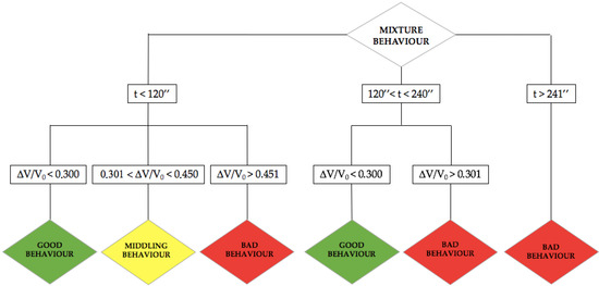 Therefore, to assess the quality of any mixture of Table 4, the flowchart of Figure 13 can be proposed. According to the results of the marsh cone test and the volumetric strain values, three main behaviours for each mixture can be assessed: good, middling, and bad. “Good behaviour” is characterized by a suitable compromise between viscosity, which must be adequate to allow the mixture to be injected into the hole with on-site machines, and the lowest compatible volumetric strain. “Middling behaviour” describes mixtures that, even if they have good viscosity, still exhibit a relatively high volumetric strain. “Bad behaviour” refers to mixtures that, even if the volumetric strain is kept at a minimum, have a viscosity that makes the mixture unsuitable for injection using on-site machines.