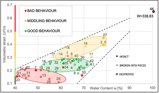 Following the flowchart in Figure 14, after adding the data for each mixture (featured by its final volumetric strain, its initial water content and its behaviour after the crumb test) the abacus in Figure 15 can be drawn accordingly. Any point on the abacus corresponds to a mixture, represented by its coordinates (i.e., initial water content and volumetric strain). Interestingly, it is possible to observe that all behaviours of the mixtures judged as “GOOD” lie mainly in the green area. While no clear trend was detected, the crumb test results suggested the persistence of intact samples in the green area. Nevertheless, to assess the quality of the mixture using crumb test results, it is crucial to standardize the tests and ensure that the number of tests is statistically significant in each area.