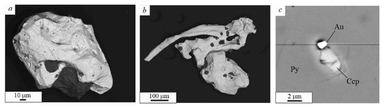 Yagodnoye ore occurrence. This occurrence has been poorly studied in the past. Herein, pyrite was shown to be the major ore mineral. Its content in mineralized rocks was not more than 1%–2%. In a few ore veinlets, chalcopyrite, galena, and sphalerite were observed. Free native gold was identified at the ore occurrence, which was extracted from the host rocks and fully disintegrated into a clayish–micaceous mass. The gold grains were 0.1–0.25 mm-sized. The gold was of ore facies, crystallomorphic and complex in shape (Figure 5a,b). The fineness of the gold was 700‰–800‰, with Ag being the major impurity (Table 4). Microinclusions of gold in association with chalcopyrite were found in pyrite (Figure 5c). Due to the small sizes, it was difficult to identify the gold composition since the analysis results always incorporated the matrix elements (Fe and S). The computed fineness of the gold was 800‰–900‰.