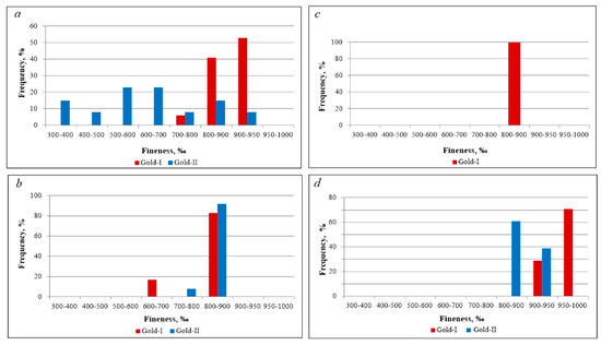 Native gold of the late stage had dimensions of more than 0.5 to 1.5–2 mm (gold II). The native gold of the Verkhneniyayuskoye-2 deposit was characterized by a relatively low fineness with a polymodal distribution on the fineness histogram. The scatter of the values of this indicator was in the region of 300‰–950‰ (Figure 9). Native gold from the Niyahoyskoye-2 and Yagodnoye occurrences was characterized by medium and high fineness, unimodal distribution on the fineness histograms, and the distribution of this index in the areas of 800‰–950‰ (Figure 9b,d). Thus, significant differences in the fineness of the gold of the early (gold I) and late (gold II) stages were observed in the Verkhneniyayuskoye-2 deposit, while they were insignificant in the other ore occurrences.