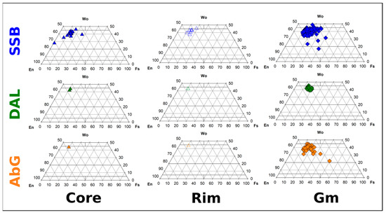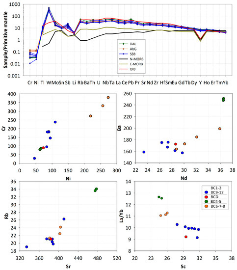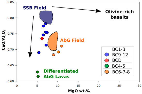 - The “Abnormal Basalt Group” (AbG) represents a fourth group of lavas, mostly outcropping on the volcano flanks and rare inside the Enclos Fouqué caldera [4,8]. These magmas are relatively depleted in CaO and SiO2 and enriched in FeO, TiO2 and K2O with respect to SSBs. The AbG lavas have alkaline affinity (7.5–10 wt.% MgO; 0.9–1.2 wt.% K2O; 8.5–10 wt.% CaO) and often transport ultramafic enclaves to the surface, these having been ripped from a depth near the mantle–crustal underplating layer [8]. Geophysical and geochemical data associated with their surface emission indicate that these magmas rose from areas at a greater depth than the other products emitted at PdF [44,50,51], having experienced differentiation at the mantle-crust underplating layer (10–15 km b.s.l.), where they are subject to CO2 flushing, magma mixing, crystal recycling/assimilation and contamination with partial melts from metasomatized cumulates [52]. Previous studies [53] have shown that the NW rift zone situated on the volcano’s flank represents a young and active corridor of SSB magmas surrounded by large-volume AbG-type eruptions.