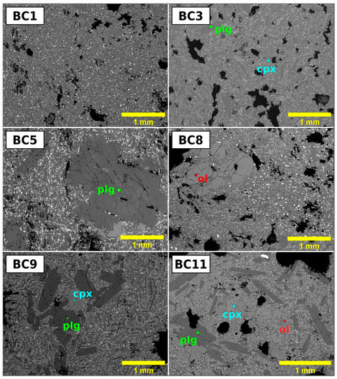 - The ‘Steady-State Basalts’ (SSB), representing the main type of basalts emitted by PdF. These products usually display a homogeneous composition (5–8 wt.% MgO; 0.5–1 wt.% K2O; 10–12 wt.% CaO) and a typically aphyric or poorly porphyritic texture, with phenocrysts represented mostly by olivine (>20% in rock volume) and minor clinopyroxene, ±plagioclase as phenocrysts [4]. SSBs are mostly emitted in the summit area of the volcano [38,39];