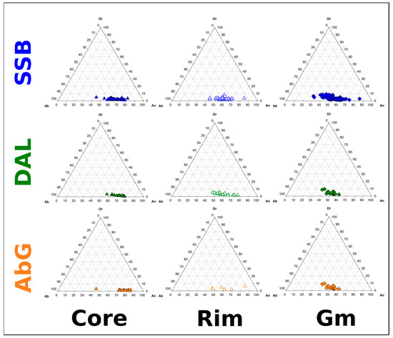 - Differentiated Alkaline Lavas (DAL) represent a relatively rare group, mostly outcropping at the base of the PdF shield edifice. They are more evolved and alkali-rich (1 < MgO < 5 wt.%; 1 < K2O < 4 wt.%) than the recent products and contain abundant feldspar indicative of shallow magmatic activity which mostly occurred in the early stages of the volcano’s history [4,46,47,48]. The notable abundance of plagioclase in these products has been interpreted as cumulitic in origin, resulting from the dismantling of anorthositic mush in the shallower portions of magma chambers formed during a decrease in magmatic flux and potentially attributable to the older Le Alizés volcano [49].