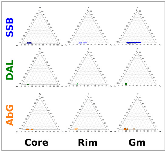 - Olivine-rich basalts, containing up to 60 wt.% of olivine and with a high and variable MgO content (8–28 wt.%), usually erupted on the flanks of the volcano during eruptions with high emission rates or in the final phases of the eruptions that started with the emission of SSB basalts [38,40,41]. The mm- to cm-sized olivine phenocrysts of these products have been interpreted as antecrysts derived from crystalline mush within dikes [42] or detached from cumulitic bodies or magma reservoirs located at a shallow depth [4,43,44,45];