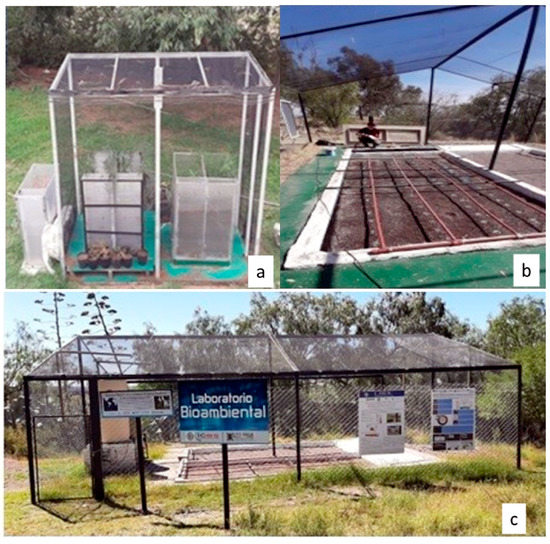 Figure 2a). The control treatment was performed with commercial soil (BS). The BR and test chamber were connected to a collection chamber (10 cm × 30 cm and 80 cm deep) to collect percolated water. These BR had a relation of 1:10 with the vegetable depuration module (VDM, TRL 6), and conserved the dimensions, slope, filter layers, physicochemical (pH, Eh), and hydraulic parameters (hydraulic constant, hydraulic retention time, and vertical income flow) [