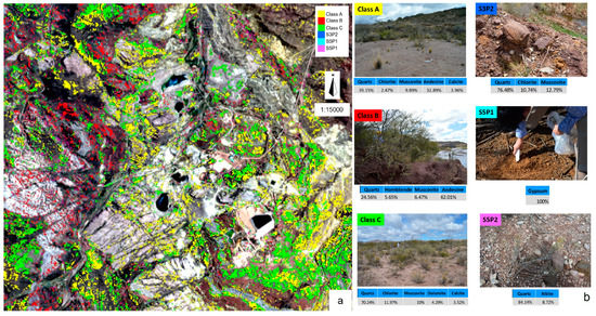 The spatial, spectral, and temporal resolution of satellite data together with data availability, data storage, and data handling limitations, have prevented the use of remote sensing in many potential applications. To try and overcome these limitations, the European Space Agency (ESA, Paris, France) and European Commission have developed a series of next-generation Earth Observation missions, called Sentinels, for land, ocean, and atmospheric monitoring, and each Sentinel mission is based on a constellation of satellites to provide accurate, timely, and free datasets. In this study, the multispectral Sentinel-2A image was downloaded from the ESA Copernicus Open Access hub and acquired in the Sierra Pintada mine area on 12 December 2018. The spatial resolution of the Sentinel-2A image is of 10 m in the visible and near- infrared range and 20 m in the short-wave infrared range, with spectral resolution ranging from 490 nm to 2190 nm. The 13 georeferenced samples, collected during the in situ sampling campaign, were overlaid on the satellite image and, for each sample, the spectral signature was acquired. Then, all the spectral signatures and mineralogical data were used as input for cluster analysis to obtain groups of spectrally and mineralogically similar samples. In particular, the average linkage between groups criterion (UPGMA algorithm) and Euclidean similarity index have been used. Afterwards, the supervised pixel-based classification was applied using the Spectral Angle Mapper (SAM) algorithm (see Guglietta et al. (2020) [