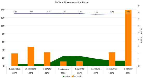 It is noteworthy that the S4P1 (Class A) and S6P1 (Class C) sites with plants with high total BCF values of Zn (47.5 and 140, respectively), had slightly alkaline soil pH values (7.84 and 7.79) and organic matter (O.M) percentages of 0.3 and 0.8, respectively.