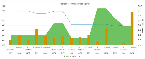 Sena aphylla biomass was higher than the other plant species. In particular, the BCF (1.35) at the S6P1 site (Class C) was higher compared to the other plant species within the same site, and the other mine sites. Furthermore, the BCF values of Sr at the S4P1 site (Class A) were equal to 0.41