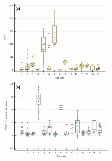 The U content of the sites of this study ranges from 3 to 6390 ppb (Appendix A), with a median value of 77 ppb. Among the sites, U varies significantly (Figure 2a). Very low median values (<15 ppb) are calculated for the sites 1, 4, and 8, while very high values are calculated (>500 ppb) for the sites 5 and 7. Intra-site variability is sometimes recognized, e.g., sites 2, 5, 6, and 7. Occasionally, outliers are detected (sites 1, 2, 3, 11, 15). Figure 2b shows the variation of the (234U/238U)i ratio: it varies between 0.91 and 2.879 (Appendix A), with a median value of 1.106. In most of the sites, the isotopic ratio is between 1 and 1.5, except for sites 4, 8, and 11, where the ratio is higher, and in general, it is correlated with a marked intra-site variability. Outliers are statistically detected in sites 2 and 9.