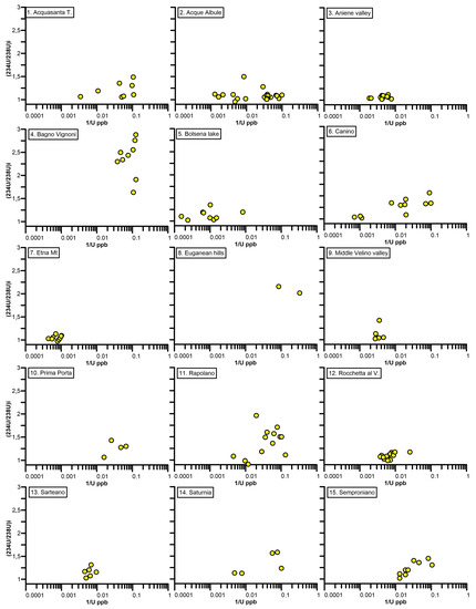 Site 15—Semproniano. The plot shows low values of U content and a (234U/238U)i ratio < 1.5; the U-ratio tends to increase as the [U] decreases. The fossil system of Semproniano is genetically connected to the hydrothermal system of Saturnia [45], and therefore the hydrogeological setting can be considered not different.