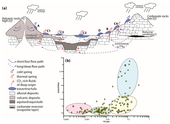 Figure 4a shows an idealized cross section that summarizes the occurrence of different travertine/tufa deposits and the interaction of the factors that influence the U behavior. In Figure 4b, the samples of travertines/tufas are grouped into four clusters that correspond to the various occurrences of the travertine/tufa deposits in Figure 4a.