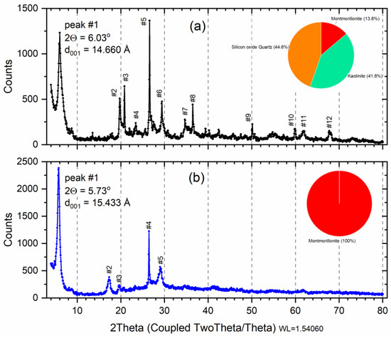 X-ray diffraction of raw smectite (a); and montmorillonite phase (b). Insert: pie chart: Red—Montmorillonite; Orange—Quartz; Green—Kaolinite. Peak number (#) listed Table 1.
