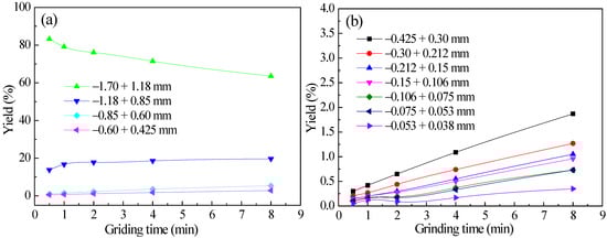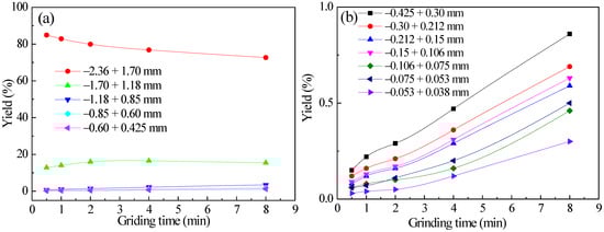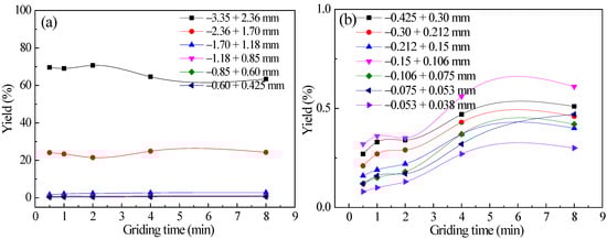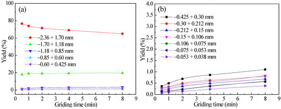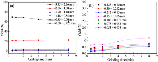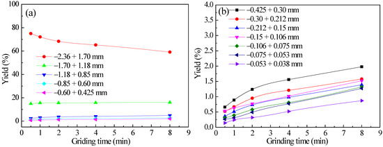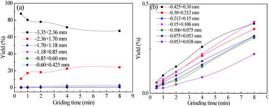 Diagrams of the yield varying of each particle size with grinding time for −3.35 + 2.36 mm feed quartz: (a) +0.425 mm each particle size and (b) −0.425 mm each particle size.