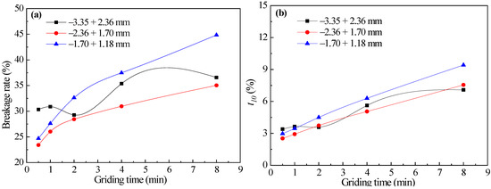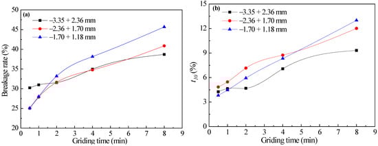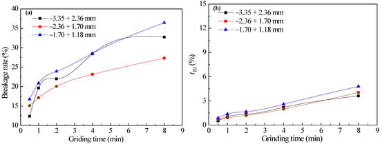 In order to further study the influence of feed-particle sizes, the grinding data of the aforementioned three feed-particle sizes −3.35 + 2.36 mm, −2.36 + 1.7 mm, and −1.7 + 1.18 mm were compared and analyzed. The breakage rates of the three feed-particle sizes of quartz calculated by Equation (4) are shown in Figure 4a. The variation of t10 values of grinding products of three feed-particle sizes with grinding time is shown in Figure 4b.