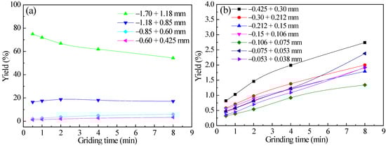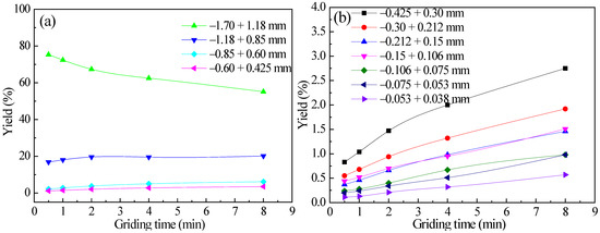 Diagrams of the yield varying of each particle size with grinding time for −2.36 + 1.7 mm feed pyrrhotite: (a) +0.425 mm each particle size and (b) −0.425 mm each particle size.