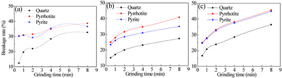 Combining Figure 4, Figure 8 and Figure 12, it can be seen that the feed-particle size affects the change rule of the mineral-breakage rate. Of the three feed-particle sizes of quartz, pyrrhotite, and pyrite, the intermediate feed-particle size (−2.36 + 1.7 mm) has the lowest breakage rate. The minimum feed-particle size (−1.70 + 1.18 mm) has the highest breakage rate and the fastest increase rate. The breakage rate of the maximum feed-particle size (−3.35 + 2.36 mm) is between the other two feed-particle sizes. Therefore, when the medium in the mill is in a cascading state, the breakage rates and their increase rates of the three minerals are not completely positively correlated with the feed-particle size.