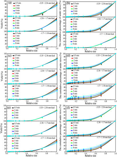 The yield and negative cumulative yield of each product size of three kinds of minerals after grinding: (a) yield of quartz, (b) cumulative yield under sieve of quartz, (c) yield of pyrrhotite, (d) cumulative yield under sieve of pyrrhotite, (e) yield of pyrite, and (f) cumulative yield under sieve of pyrite.