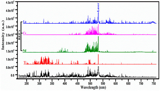 We adopted a fast procedure for the qualitative elements analysis of the REE samples acquired from a specific area of Pakistan. In the first step, we recorded the LIBS spectra of all the pure rare earth oxides, and an atlas of the spectra was prepared as a reference. In the next step, the spectra of the unknown samples were recorded under identical experimental conditions. In the third step, the qualitative analysis was performed by comparing the spectrum of the sample under investigation with that of the REE spectra and locating the common lines. This procedure helped us to pinpoint the presence of REEs in the sample within a very short time. Figure 2 shows the emission spectra of the sample along with that of REOs (La, Ce, Nd), and Ti recorded using laser pulse energy covering the wavelength region from 250 nm to 750 nm.
