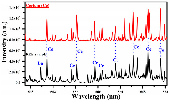 In Figure 4, we show a comparison between the spectra of Ce and the sample covering the wavelength region 547 nm to 572 nm. In this region, the main emission lines of Ce I at 544.92, 556.60, 559.59, 560.13, 567.78, 569.29, 569.70, 571.90, 577.31, 578.82, 581.29, and 594.09 nm have been identified. The common lines in the spectra of cerium and the sample are marked with blue dotted lines, showing that most of the lines belong to Ce. The spectral lines of Ce observed in this experiment are enlisted in Table 1. Interestingly, a strong emission line of La I at 550.13 nm is also observed in this selected region, which reveals the presence of La in the sample. Certainly, in Figure 2, the most interesting region for the cerium (Ce) is from 470 to 570 nm. We observed a rich spectrum of cerium (Ce) with that of lanthanum (La) and neodymium (Nd) from 470 nm to 570 nm. The emission lines at 471 nm, 479 nm, 482 nm, 500 nm, 504 nm, 518 nm, 524 nm, 527 nm, 535 nm, 546 nm, 551 nm, 556 nm, 566 nm, and 569 nm coincide in the wavelength region from 470 nm to 570 nm. We have reproduced the spectral region from 547 nm to 572 nm because of the minimum interference of the cerium (Ce) lines with that of lanthanum (La), as shown in Figure 4.