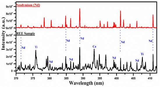 In Figure 5, the spectrum of the REE sample is compared with that of neodymium oxide, covering the spectral range from 370 nm to 415 nm. Several lines are common between the two spectra, particularly around 385 nm, 389 nm, 401 nm, and 411 nm, and are marked in blue color, which qualitatively establishes the presence of Nd in the sample. It is, however, worthwhile to mention that the strong emission lines of Ti I at 376.34 nm and Ca II at 393.37 nm are also present in this spectral region. Although the most interesting region for neodymium (Nd) is from 470 nm to 570 nm, as shown in Figure 2, this region contains several lines of the neodymium (Nd) that overlap with that of the La and Ce. For instance, the lines at 470 nm, 479 nm, 482 nm, 485 nm, 488 nm, 489 nm, 492 nm, 521 nm, 524 nm, 527 nm, 529 nm, 530 nm, 535 nm, 548 nm, and 566 nm are observed overlapping with that of La and Ce lines. Therefore, we have presented the spectral region from 370 nm to 415 nm where Nd lines appear dominantly. The major emission lines of Nd I have been identified at 463.42, 488.38, 489.69, 492.45, 494.48, and 495.48 nm, and are presented in Table 1.