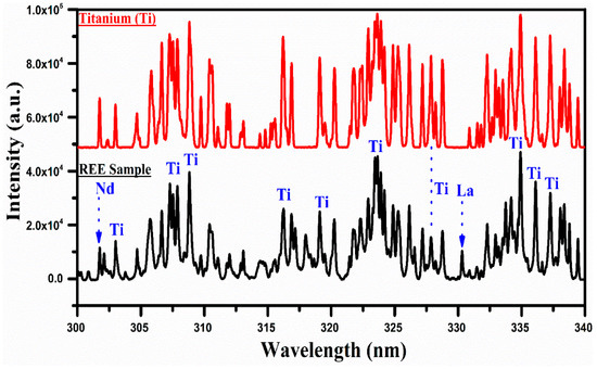 The spectral lines of each element in the sample have been identified with the help of the NIST database [33]. Moreover, in the present study, the experiments were conducted in air at atmospheric pressure. The Hα line was not detected in these spectra as we dried the sample in an oven for more than 10 h to remove moisture. The identified spectral lines, along with their wavelengths, are presented in Table 1. To elaborate on the persistent lines of Ti, La, Ce, and Nd in the spectra of the rare earth sample, we present different sections of the spectra in Figure 3, Figure 4, Figure 5, Figure 6 and Figure 7.