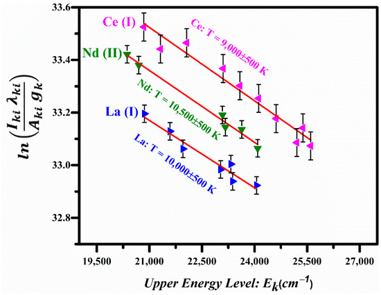 Here, is the intensity of the spectral line due to the k→i transition, is the spectral wavelength, h is the Planks constant, c is the speed of light, is the transition probability, is the statistical weight of the upper level, is the energy of the upper level, is the Boltzmann constant, Te is the excitation temperature, N is the total number density, and is the partition function. A plot of the left-hand side of this equation versus the energies of the upper levels yields a straight line and its slope is equal to . The Boltzmann plots corresponding to the La I, Ce I, and Nd II lines are shown in Figure 8, displaying good linearity; the linear correlation coefficients are , , and . The excitation temperatures were determined from the slopes of the lines corresponding to La I, Ce I, and Nd II as 10,000 ± 500 K, 9000 ± 500 K, and 10,500 ± 500 K respectively.