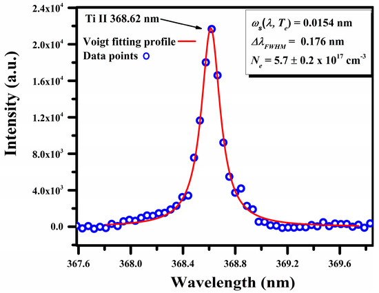Here, represents the full width at half maximum, denotes the Stark broadening parameter (0.0154 nm) specific to the Ti II line being considered, and Nr indicates the reference number density, which is for the singly ionized line. A Voigt fitting profile of the Ti II line at 368.62 nm, which takes into account the instrumental resolution and the Doppler width [40], is reproduced in Figure 9. The calculated value for the is .