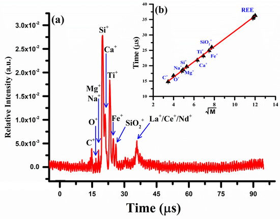 The concentration (Wt.%) of each constituent in the sample was calculated using Equation (9). To validate the LIBS results, the elemental analysis was also performed using a locally constructed two-meter linear laser ablation time-of-flight mass spectrometer (LA-TOF-MS) [30,32,46]. The mass spectrum of the rare earth sample obtained by LA-TOF-MS is shown in Figure 10. The spectrum shows the ion signals corresponding to all the constituent elements, C, Na, Mg, Si, Ca, Fe, and Ti together with the rare earth elements, La, Ce, and Nd. The peak height of each element reflects its concentration, which was determined from the area under the curve analysis. Silicon is the dominant element followed by titanium and iron. A contour around 35 μs has been observed that corresponds to all the rare earth elements present in the sample, lanthanum, cerium, and neodymium. As lanthanum has no isotopes, but Ce possesses four isotopes and neodymium has five isotopes, therefore, their signals became merged and formed a broad contour. To extract the compositions of these elements, a deconvolution procedure of the overlapping peaks was performed using commercially available software (Origin 2023). A linear regression calibration graph between the time-of-flight (T) and the square root of the mass () is presented as an inset (b) in Figure 10 and exhibits a strong correlation, with .