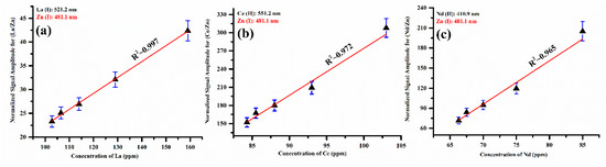 The characteristic spectral lines such as La (I) at 521.2 nm, Ce (II) at 551.2 nm, Nd (II) at 410.9 nm, and Zn (I) at 481.1 nm were selected in the present analysis. The zinc emission line is used to normalize the signal amplitude of the La, Ce, and Nd lines by taking the fraction of the signal amplitude of the corresponding line to the signal amplitude of the Zn (I) emission line at 481.1 nm. In the LIBS spectrum of the five prepared zinc-matrix-based samples, the Zn emission lines were found to be free from interference and self-absorption. The calibration curves of the elements La, Ce, and Nd present in the zinc matrix showed good linear fitting, as shown in Figure 12a–c, within the experimental error.