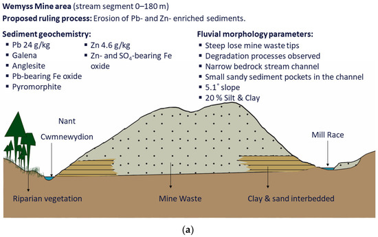In the erosional area (0–180 m), Zn and Pb primary minerals or secondary phases, such as anglesite, can be washed downstream via degradation processes (Figure 2a). Anglesite minerals, being stable in circum-neutral streamwater [9], may contribute to the suspended sediment, particularly during high-flow conditions, as reflected in the unfiltered Pb load increase during high-flow conditions (Table 2). Similarly, Kincey, et al. [11] observed the erosion of the waste from a spoil tip with the exposure of fresh waste to weathering conditions and the transport of metal-enriched sediments.