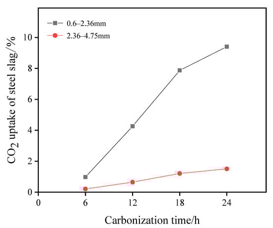 The carbonation effect of 0.6–2.36 mm particles reached 9.40% after 24 h of carbonation treatment, while that of particles with a size range of 2.36–4.75 mm reached 1.51%. Considering the greater activity of fine particles than coarser ones, the experimental results indicate that the smaller the particle size of the steel slag is, the higher the carbon fixation rate is. This result is consistent with the results obtained in a study by Huijgen, W. [21] on the carbonization behavior of steel slag in water suspension. Based on the results of carbonization curing, steel slag particles of different grades can absorb CO2 at different degrees, and with the growth in the carbonation curing time, the CO2 of steel slag aggregate particles’ retention rate also increases, which can effectively retain CO2 to seal CO2 gas in steel slag.
