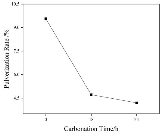 Figure 3 shows the pressure vaporization rate results of coarse-grained material (4.75–2.36 mm). The test results show that the pressure vaporization rate of steel slag aggregate (4.75–2.36 mm) decreased from 9.57% to 4.72% and 4.20% after carbonization curing for 18 and 24 h, respectively. The basic oxides in the structure, such as magnesium oxide and calcium oxide, can effectively absorb the CO2 gas around the system and generate stable carbonate to improve the stability. Moreover, with an increase in the carbonization curing time, the pulverization rate of steel slag particles displayed a downward trend under a saturated steam pressure of 2.0 MPa, indicating that the stability of steel slag particles was substantially enhanced.