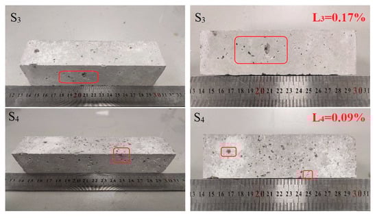 Figure 4 shows the stability test results of materials carbonized for 18 and 24 h under a pressure of 0.5 MPa and a treatment time of 1.5 h. The test results show slight local pitting and spalling phenomena on the surface of the specimen, but the whole specimen is intact. Under a pressure of 0.5 MPa and a treatment time of 1.5 h, the autoclave method for soundness increased with an increase in the carbonation curing time, and the volume stability increased. Considering the presence of f-CaO and f-MgO components in steel slag, Ca(OH)2 and Mg(OH)2 were gradually generated in the hydration reaction, resulting in the volume change of the block before and after the reaction and then local pitting and cracks on the surface of the specimen.