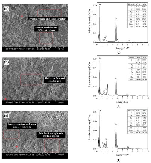 Scanning electron microscopy (SEM) images of the samples and associated energy-dispersive spectroscopy (EDS) results. (a) SEM image of uncarbonized steel slag sample S0; (b) SEM image of steel slag sample after 18 h of carbonization S3; (c) SEM image of steel slag sample after 24 h of carbonization S4; (d) EDS result of uncarbonized steel slag sample S0; (e) EDS result of steel slag sample after 18 h of carbonization S3; (f) EDS result of steel slag sample after 24 h of carbonization S4.