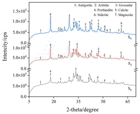 Figure 6 shows steel slag particles with a size of 0.6–2.36 mm and the XRD pattern of three groups of materials cured under different carbonization times, labeled raw ore S0 (not carbonized), S3 (carbonized for 18 h), and S4 (carbonization for 24 h). The XRD pattern shows that the undisturbed steel slag contains more silicate minerals when it has not been carbonated. At a temperature of 25 °C, relative humidity of 75%, and a CO2 concentration of 20%, after carbonation curing, the CaO in the sample particles and the calcium-rich mineral components react, the calcium mineral phase diffraction peak decreased, calcium carbonate diffraction peak appeared, and a calcium carbonate substance was generated (CaCO3, PDF-#05-0586). The calcium ferrite groups emerged progressively, predominantly in the form of siderite (FeCO3, PDF-#08-0133). After 24 h of carbonization curing, the particle components absorbed CO2 and generated carbonate substances, resulting in the appearance of magnesium carbonate products, such as artinite (Mg2CO3(OH)2 • 3H2O, PDF-#06-0484) and magnesite(MgCO3, PDF-#08-0479). This process resulted in CO2 absorption and improved the strength of granular materials.