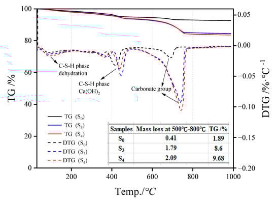 Figure 7 represents the S0, S3, and S4 TG-DTG analysis results. The mass difference of 50 °C–350 °C is caused by the evaporation of interlayer water in the C-S-H structure [16], while that at 200 °C–500 °C is due to the loss of a hydroxyl group in the product structure [17], and that between 500 °C–800 °C is mainly related to carbonate materials [18,19]. The endothermic peaks of dehydration and decomposition of carbonate materials in the C-S-H structure of uncarbonized steel slag are considerably smaller than those in the hydroxyl structure, indicating the presence of a certain amount of hydration products in the slag, but the amount is small. After carbonation curing, the peaks of the three substances in steel slag aggregate changed substantially. The peaks in the range of 500 °C–800 °C changed the most, indicating that the carbonate products showed an increasing trend, and the increment was CO2 absorption. The carbon contents in S0, S3, and S4 were 1.89%, 8.60%, and 9.68%, respectively.