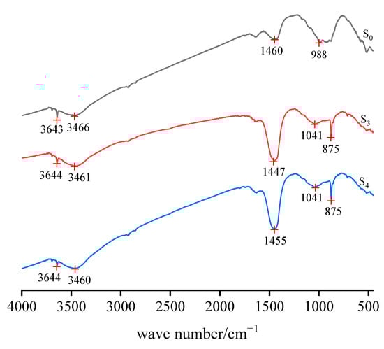 Figure 8 shows the S0, S3, and S4 infrared absorption spectra of the sample. The relative strength of the infrared absorption peak reflects the content of the group. The greater the peak strength of a position in the figure is, the higher the content of the group in the position is. The absorption band at 3460–3644 cm−1 represents the O–H stretching vibration band belonging to the water molecule products of hydration in the steel slag structure. The samples carbonized for 18 h (S3) and 24 h (S4) showed carbonic acid–base groups, and the absorption vibration peaks were observed at 1455, 1447, and 875.28 cm−1. The increase in the relative strength of the absorption vibration peak of the carbonate base group can reflect the increase in its content, which proved the formation of carbonate substances, and the quality of carbonated products increased with an extension of the carbonization time. Moreover, the absorption and vibration peak of the Si–O group was 988 cm−1. The results agree with the XRD and TG-DTG analysis.