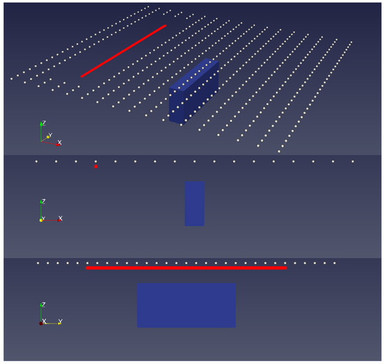 Sketch of the 3D SAEM model. White points are receivers (50 m in the air); red line is the ground transmitter. Data points are removed within a distance of 400 m from the transmitter. The resistivities of the block and background were 1 and 300 m.