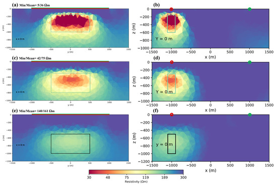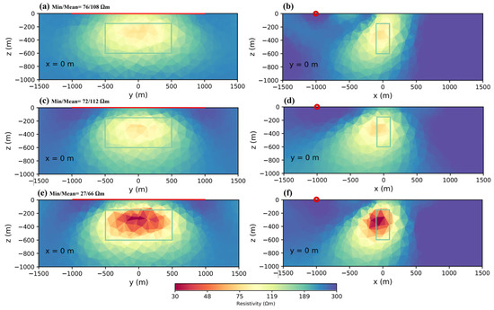 As mentioned previously, we did not consider the data points up to a certain distance from the transmitter, typically 400 m [28,32]. By considering a respective model, as before, we removed the data around the transmitter up to a distance of 400 m from each side. The results showed that, in this case, when the block was located at a depth of 150 m below the transmitter, it was recovered well (Figure 11a,b). In the second case, when the block was placed at a depth of 300 m, it was relatively well recovered (Figure 11c,d); however, when it went to a depth of 500 m, it became difficult to identify its location and the numbers increased drastically (Figure 11e,f). As explained in the previous section, it is better to use two transmitters. Using this method, we could use one of the transmitters to cover the data near the other one, which helped to estimate the depth of the investigation and provide better resolution of the results. Figure 12 shows that covering the masked data point with another transmitter helped to image the block at a depth of 500 m with a higher resolution, compared to using one transmitter. Figure 11e,f and Figure 12e,f show that, for the target at 500 m, in the case of just one transmitter, we could reach a min/mean of 188/213 Ωm. By using two transmitters, the resolution increased and we reached a min/mean of 140/161 Ωm. We thus conclude that we can still recover an anomaly underneath the transmitter without data points being located exactly on top of the body.