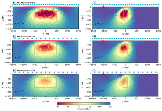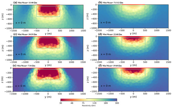 Cross-sections (y–z and x–z planes) of inversion results for different components: (a,b) x-component; (c,d) z-component; and (e,f) xyz (multi)-component. In all figures in this paper, when the transmitter was perpendicular to the plane, it is shown as a red circle, whereas it is shown as a red straight line when it was parallel to the plane. In the title, the minimum and mean resistivity values inside of the target dimensions (blue rectangles) are provided as a quantitative measure of resolution.