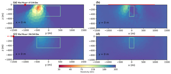 In many cases of mineral exploration, there is at least some geological and geometric information on the target, based on preliminary studies. In this situation, we have some general knowledge of the target, and it is the best-case scenario because we know we should lay down the transmitter cable parallel to the main strike of the target to have the best coupling of the transmitter and target. To demonstrate this, we assumed the same model as in the previous section. Figure 4c shows that the best results were obtained when the target was closer to the transmitter (1 km) and the transmitter length was twice the length of the target. This time, we laid down the cable perpendicular to the body. Figure 6a,b shows that, in this model, the block was perpendicular to the transmitter. In this situation, even when the right side of the block was located only 500 m from the transmitter, the results were not good. We could not recover the body boundaries, except when the block was just in front of the body. This result can be seen based on the obtained numbers. The minimum resistivity was 47 Ωm; this was not too bad, compared with the situation when the transmitter was parallel to the block and the minimum was between 10 and 25 Ωm. However, the mean of the cells inside of the target (218 Ωm) showed the result was not good and this number was closer to the background. This means we could not detect the whole body. In Figure 6c,d, the conductive body was 2 km away from the transmitter and we could not even see the front of the body in good resolution. The min/mean was 186/260 Ωm, and it was hard to distinguish the body from the background. This examination shows the importance of carrying out geological studies to obtain information on the target geometry before designing the survey.