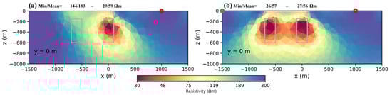 Inversion results of using two transmitters perpendicular to each other. Cross-sections (a) y–z plane and (b) x–z plane of inversion results.