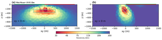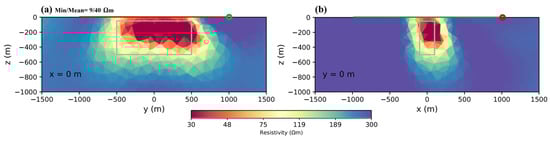 In previous models, we assumed that we knew the general strike of the target and we laid down the Tx cable parallel and also perpendicular to it. The results showed that the parallel configuration was much better. If we did not know the target geometry, one reasonable idea would be to use more than one transmitter in a way that the transmitters are perpendicular to each other. A sketch of such a model is presented in Figure A2 as an Appendix A. Figure 8 shows the results using the perpendicular layout. The body was recovered with a higher resolution and the resistivity distribution was more limited to the body. To prove this design method, we considered a more complex model that included a dipping plate with dimensions of 100 m × 500 m × 100 m, a dip angle of 45 degrees, and an azimuth of 45 degrees. The center of the plate was located at a depth of 300 m from the surface of the earth. Figure 9a shows the front view and Figure 9b shows the side view of the plate inversion. The plate was recovered with a good resolution so that the resistivity distribution followed the plate geometry. The min/mean was 15/52 Ωm, representing good results compared with the block numbers of min/mean = 9/40 Ωm. In addition, the block was bigger and easier to detect. In the absence of information concerning the target, it is better to use at least two perpendicular transmitters. From a logistical point of view (i.e., the installation of grounding points), it is better if one end of the transmitter is close to the other; alternatively, the same grounding station can be used at the same end (Figure A2 and Figure A3 in the Appendix A).