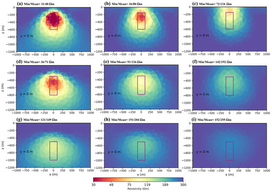 Inversion results for a body located at different depths: (a–c) 150 m; (d–f) 300 m; and (g–i) 500 m from the surface, and for different transmitter distances: (a,d,g) 2 km; (b,e,h) 3 km; and (c,f,i) 4 km.