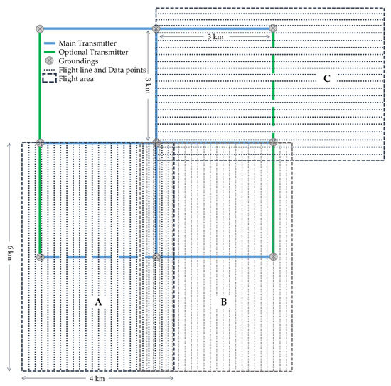 Recommended optimized survey layout (to be adapted to field conditions). The length of all transmitters and spacing between parallel transmitters was 3 km, using common groundings that reduced logistic effort. Three of the overlapping flight patches are given as examples (each covering an area of 24 km2): (A) over the lower-left Tx (dashed blue), (B) over the lower-right Tx (solid blue), and (C) over the optional Tx (dashed green).